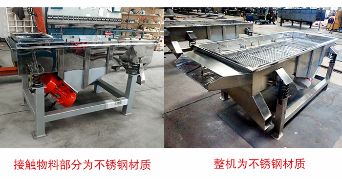 直線振動篩有兩種選擇方式:①接觸物料部分為不銹鋼材質(zhì),其他部分為碳鋼材質(zhì),②整機(jī)為不銹鋼材質(zhì),具體選擇哪種不銹鋼直線振動篩,還需要根據(jù)物料性質(zhì)以及用戶的實際需求選用不同的材質(zhì),如果您的適用場景對衛(wèi)生要求高的話可以采用第二種方案。