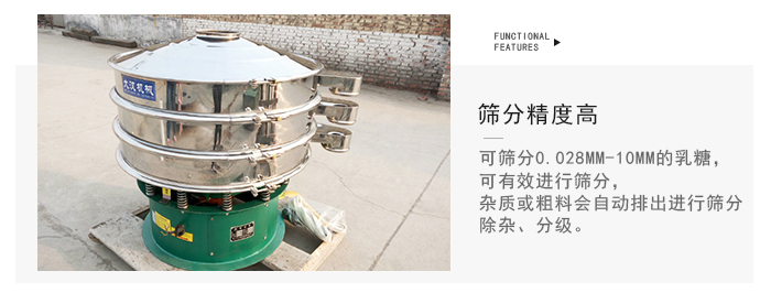 1、篩分精度高可篩分0.028mm-10mm的乳糖,可有效進(jìn)行篩分,雜質(zhì)或粗料會(huì)自動(dòng)排出進(jìn)行篩分、除雜、分級(jí)。篩分過程中乳糖過網(wǎng)率達(dá)95%以上。篩分精度高。