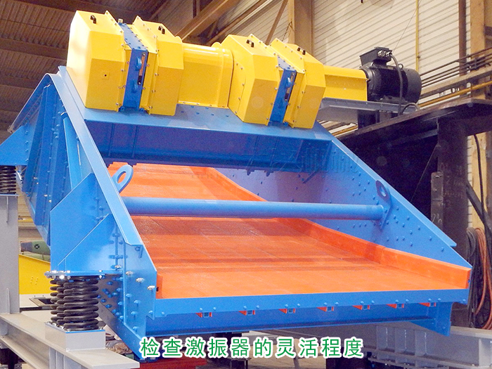 檢查激振器的靈活程度,用手轉(zhuǎn)動(dòng)皮帶輪使偏心塊脫離平衡位置后,應(yīng)出現(xiàn)數(shù)次自由擺動(dòng),如篩子到貨后時(shí)間超過(guò)半年后才安裝,激振器應(yīng)全部拆下重新清洗加油。