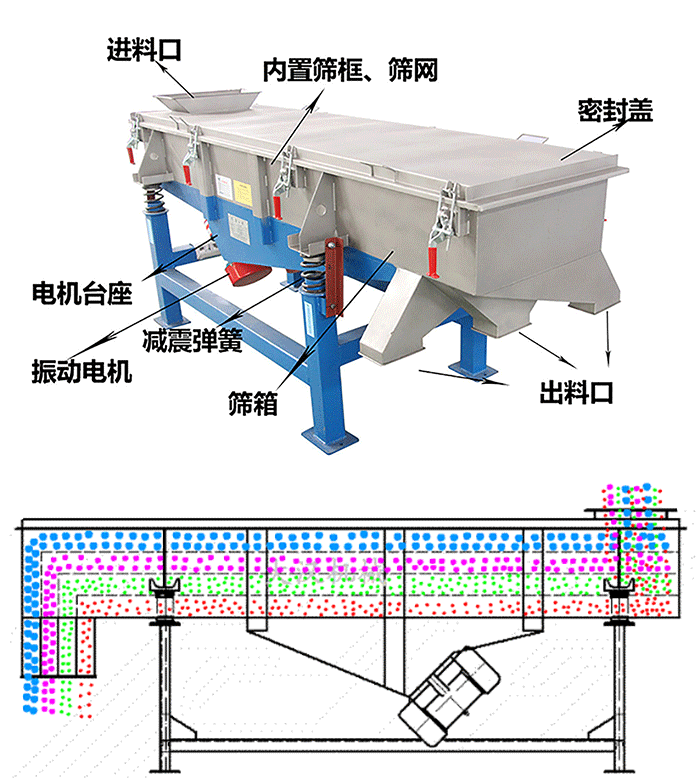 直線篩直線振動篩是一樣的產(chǎn)品其結(jié)構(gòu)可簡單分為:進料口、篩機蓋、篩板、出料口、彈簧和電機。
