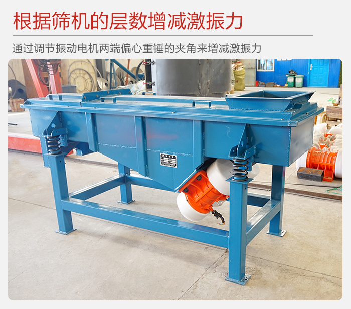 5、用戶可根據篩機的層數,物料比重不同來增減篩機的激振力(通過調節振動電機兩端偏心重錘的夾角來增減激振力),使篩機達到最佳的篩分效果。